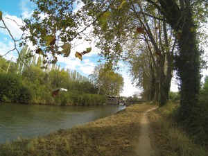 Maintenant loin de la ville nous longeons plutôt l’autoroute et les chaps de blé, de maïs ou de tournesols en parcourant le Canal du Midi et en découvrant le plaisir de ces ombrages à une heure où le soleil est au plus haut et au plus chaud.