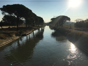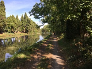 Nous arpentons un bord de Canal fait de route, et de terre roulante. Nous profitons de l’ombre des pins ou des platanes selon les endroits et profitons aussi de la couverture que ces derniers offrent face au vent. Le cadre est enchanteur.