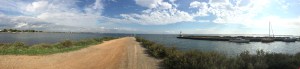 Il nous reste encore un dernier effort à fournir pour pousser nos vélos (avec nos jambes) jusqu’à Sète. Un gros effort en fait. La piste cyclable entre Marseillan et Sète, si elle est très confortable, s’étant su plus de 8 kilomètres et nous faisons face au vent. Je profite de ce coin de France que j’aime tant, entouré par les eaux de l’étang de Thau et la mer sous ce ciel à la couleur si chaleureuse.