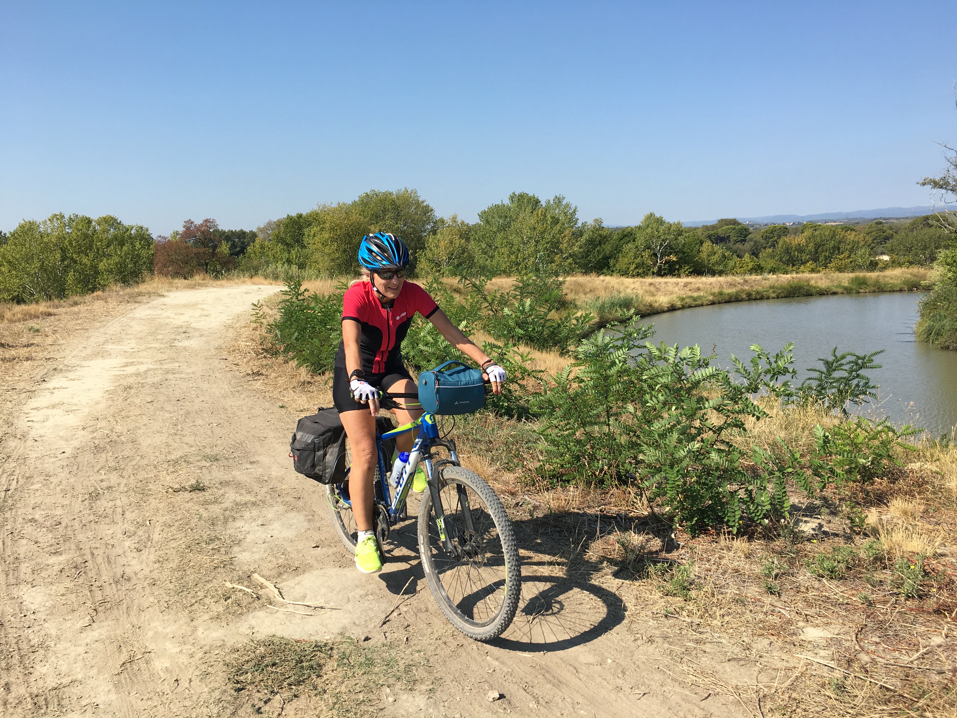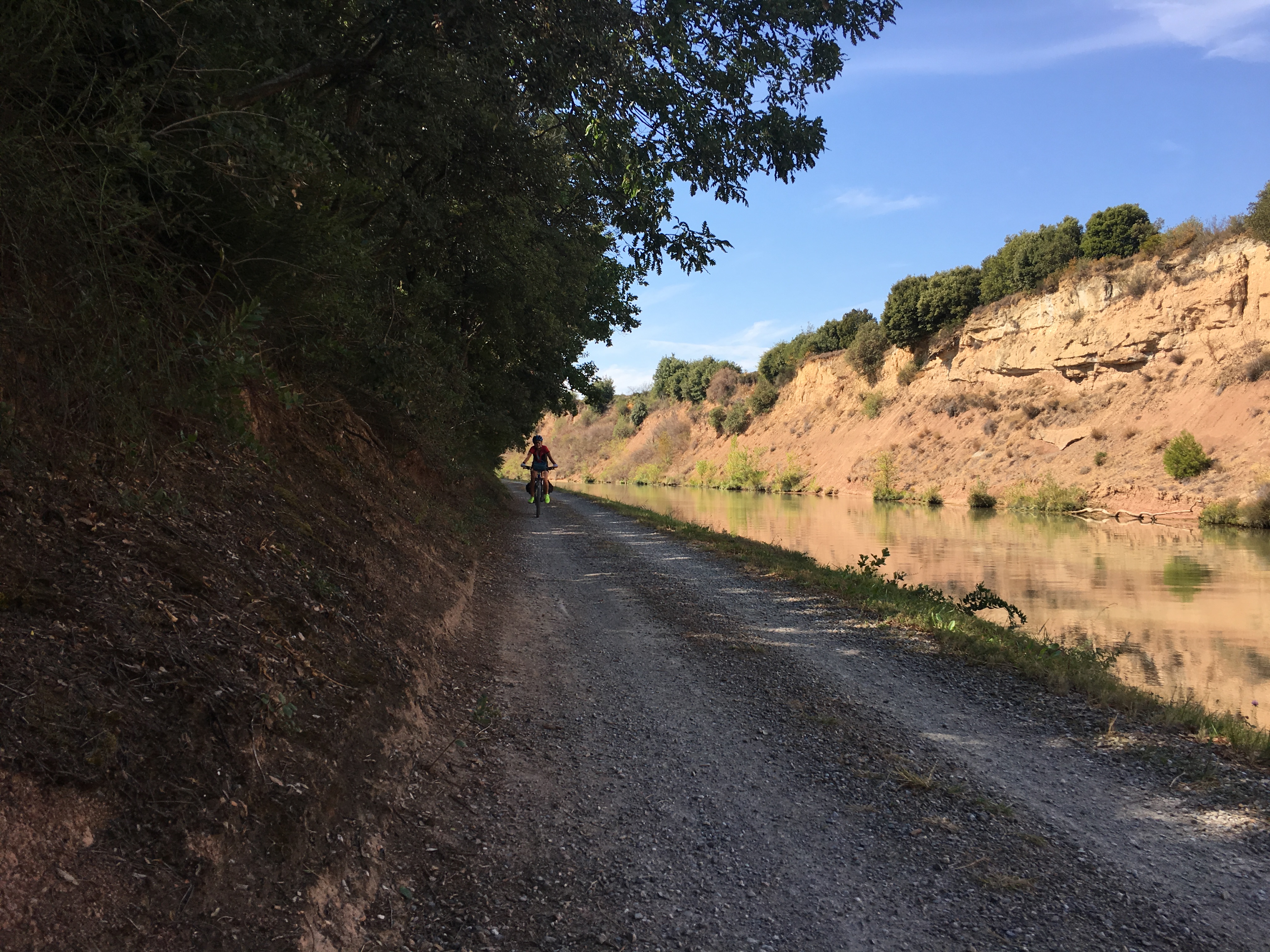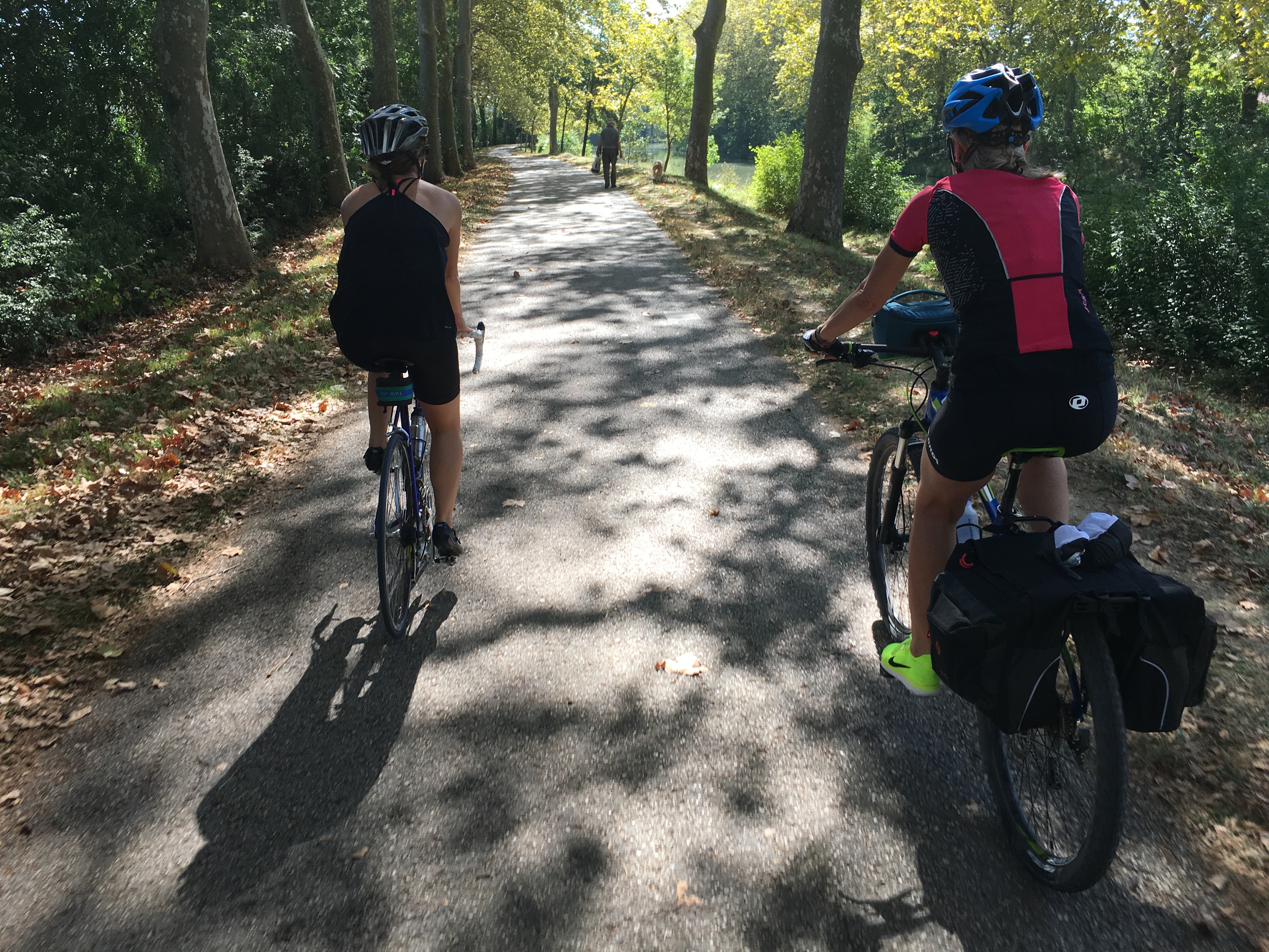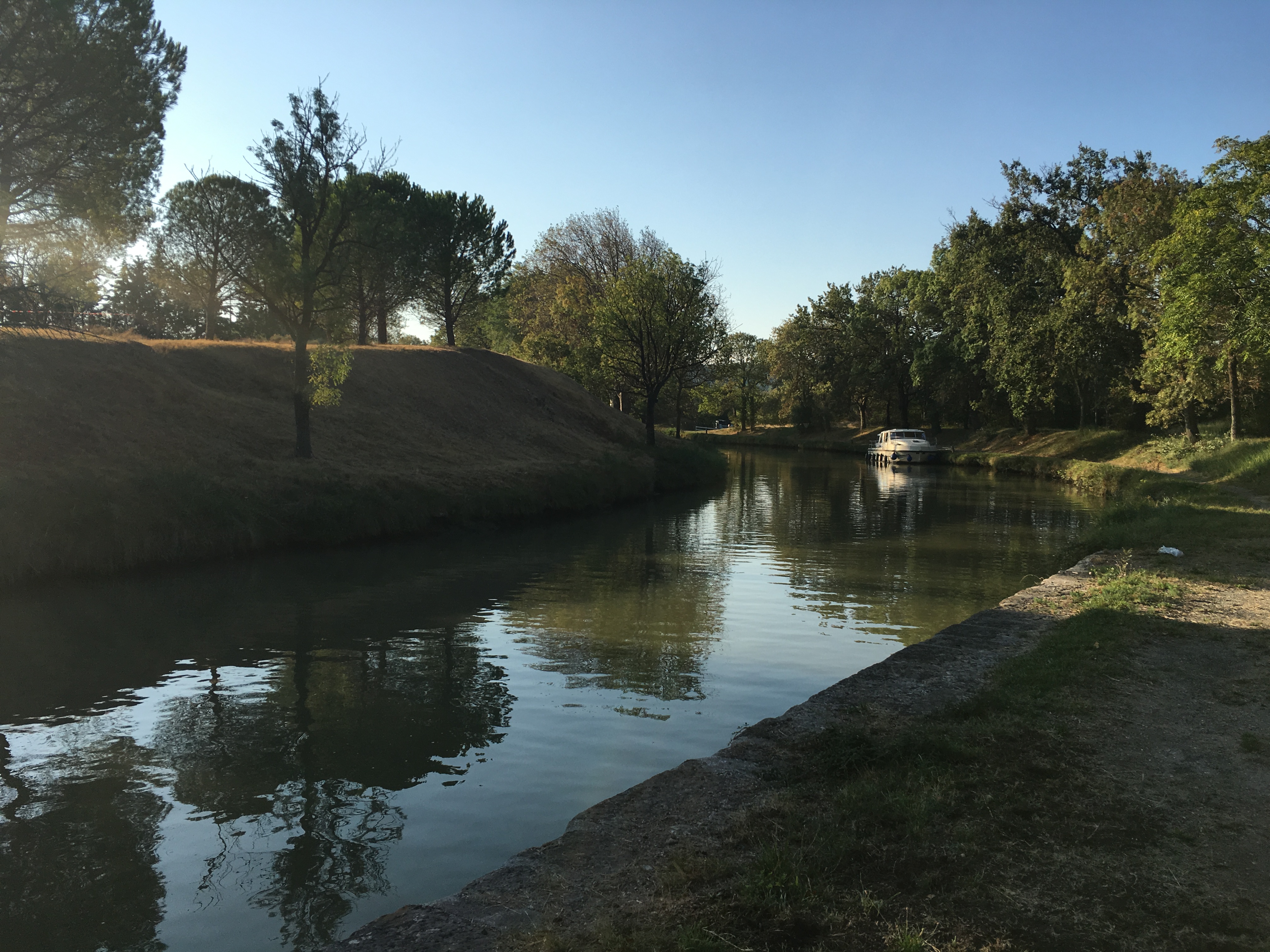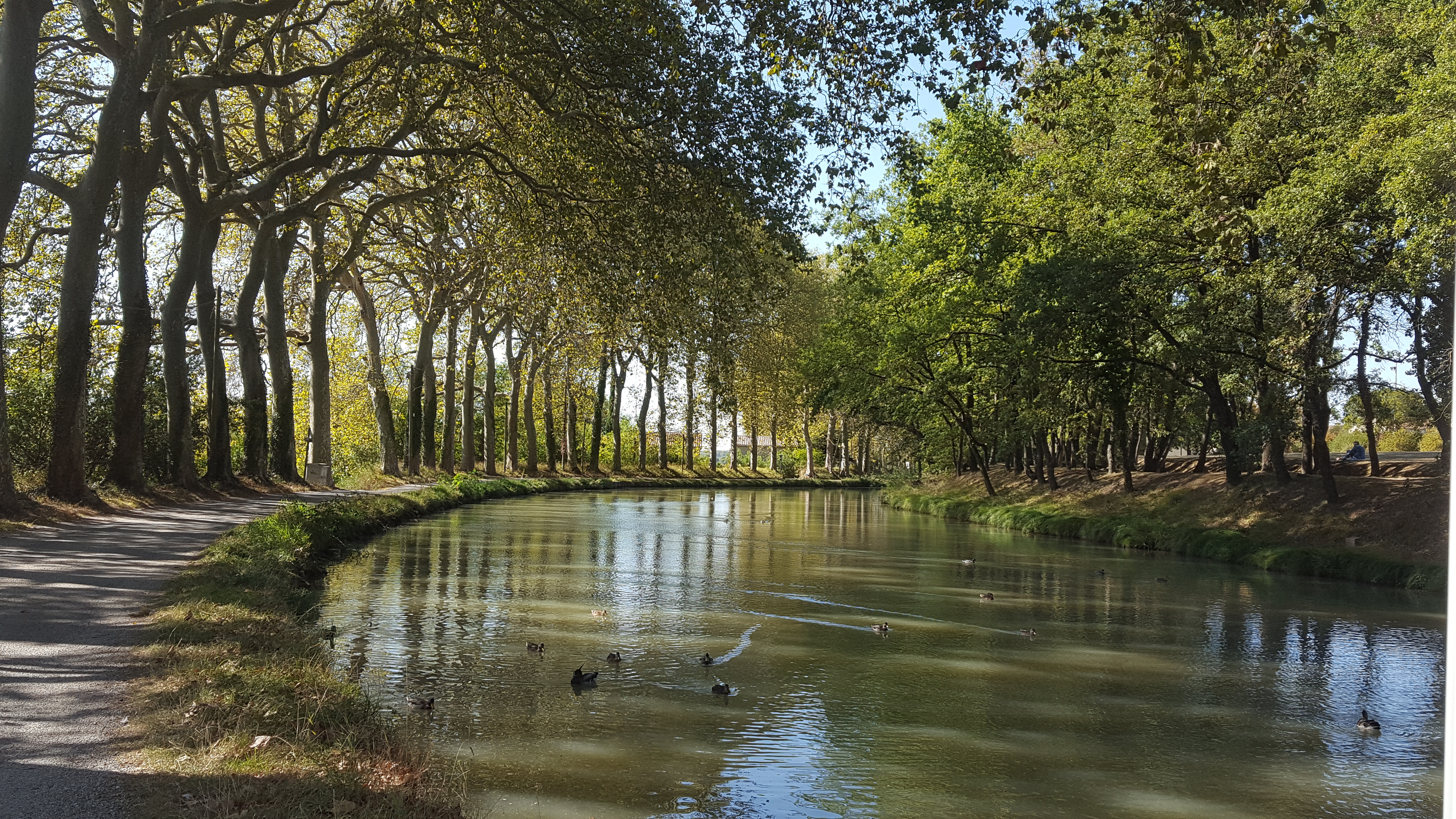 Nous arpentons un bord de Canal fait de route, et de terre roulante. Nous profitons de l’ombre des pins ou des platanes selon les endroits et profitons aussi de la couverture que ces derniers offrent face au vent. Le cadre est enchanteur.