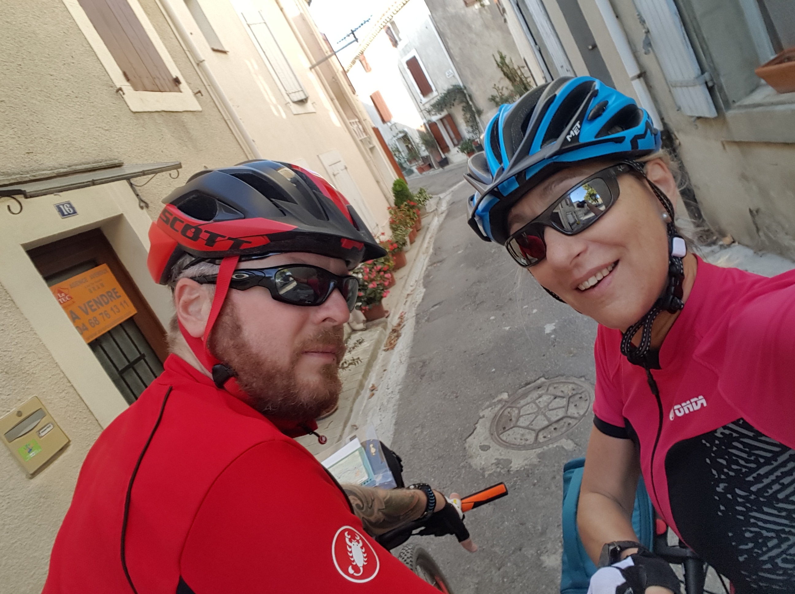 Sans traîner, mais bien reposé, nous remontons sur nos deux roues. Encore une quarantaine de kilomètres au moins pour arriver à Homps, notre ville étape.