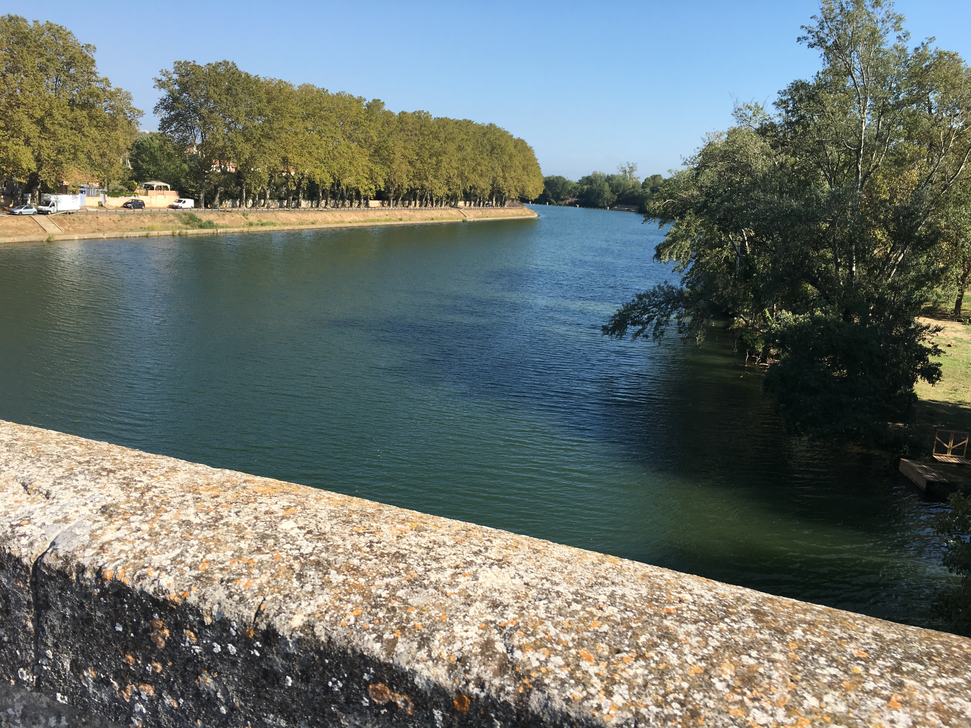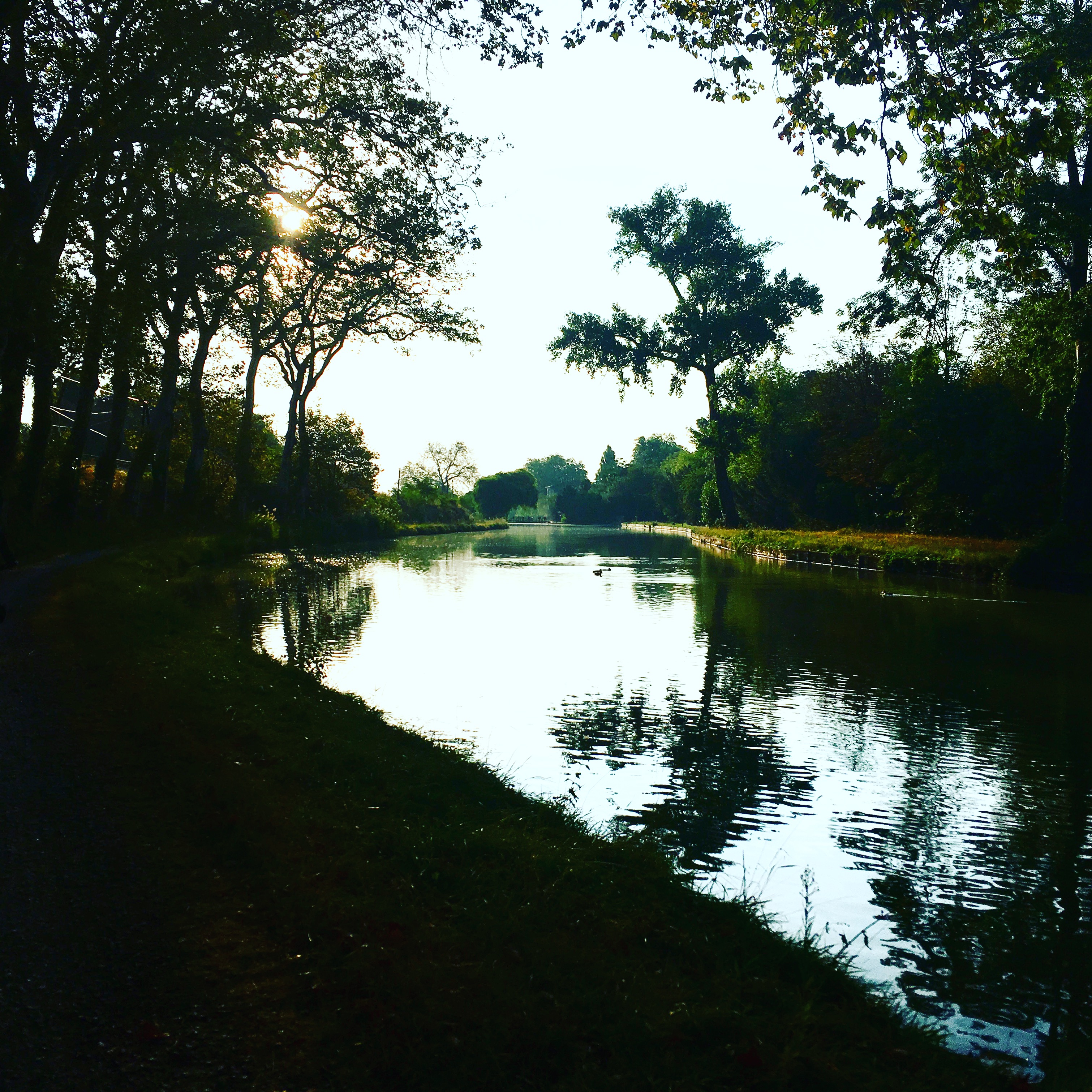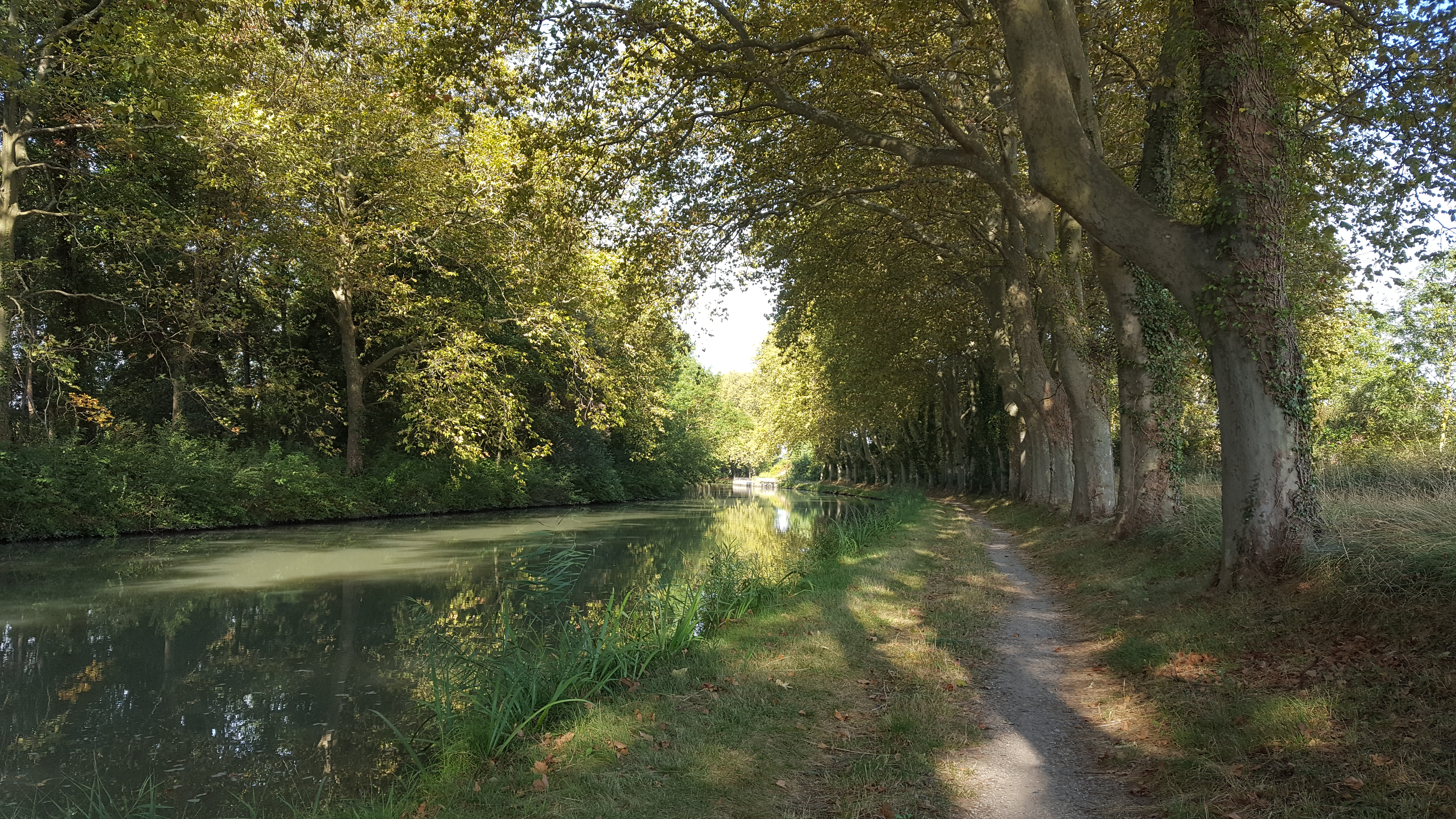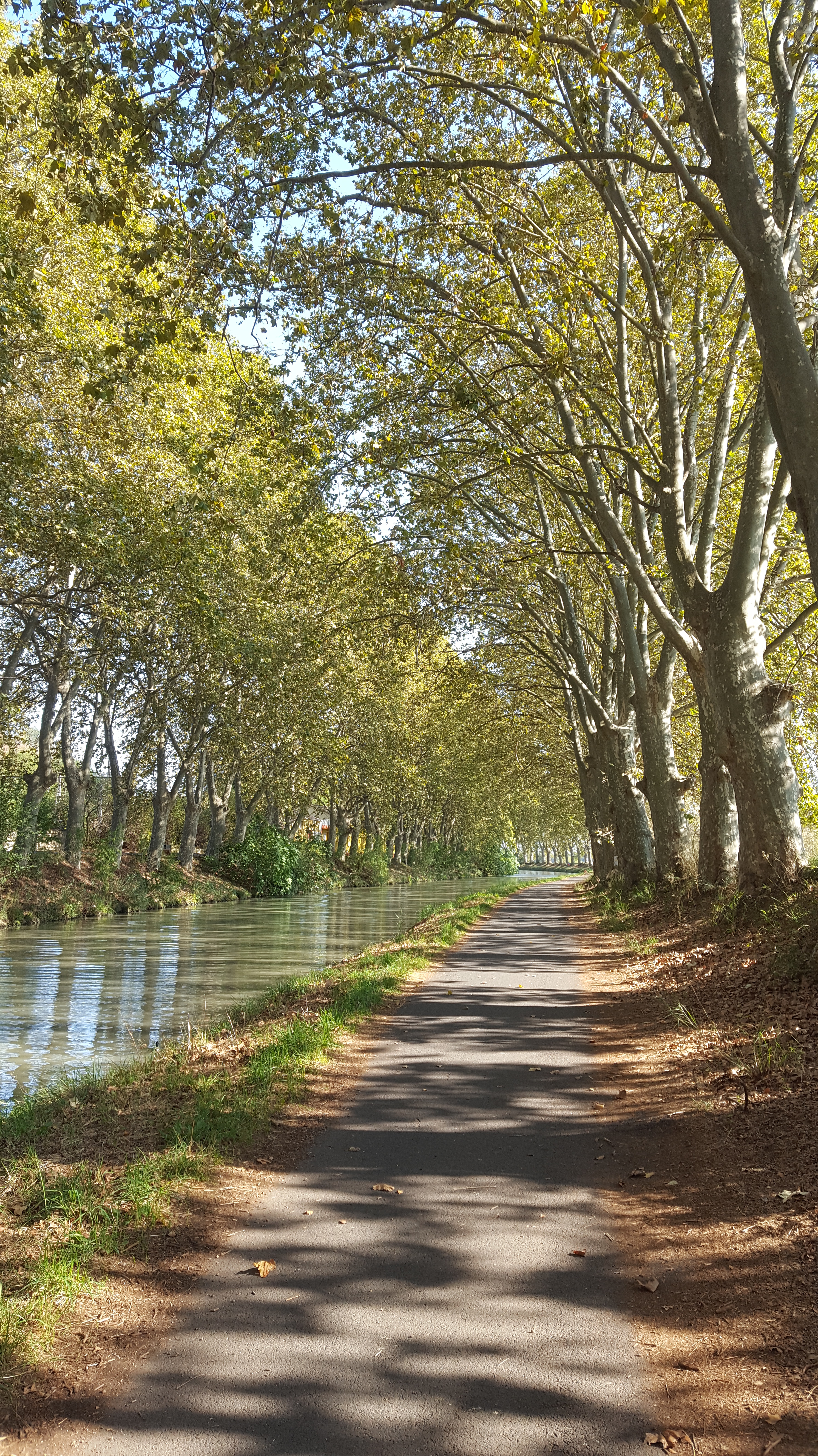 Maintenant loin de la ville nous longeons plutôt l’autoroute et les chaps de blé, de maïs ou de tournesols en parcourant le Canal du Midi et en découvrant le plaisir de ces ombrages à une heure où le soleil est au plus haut et au plus chaud.