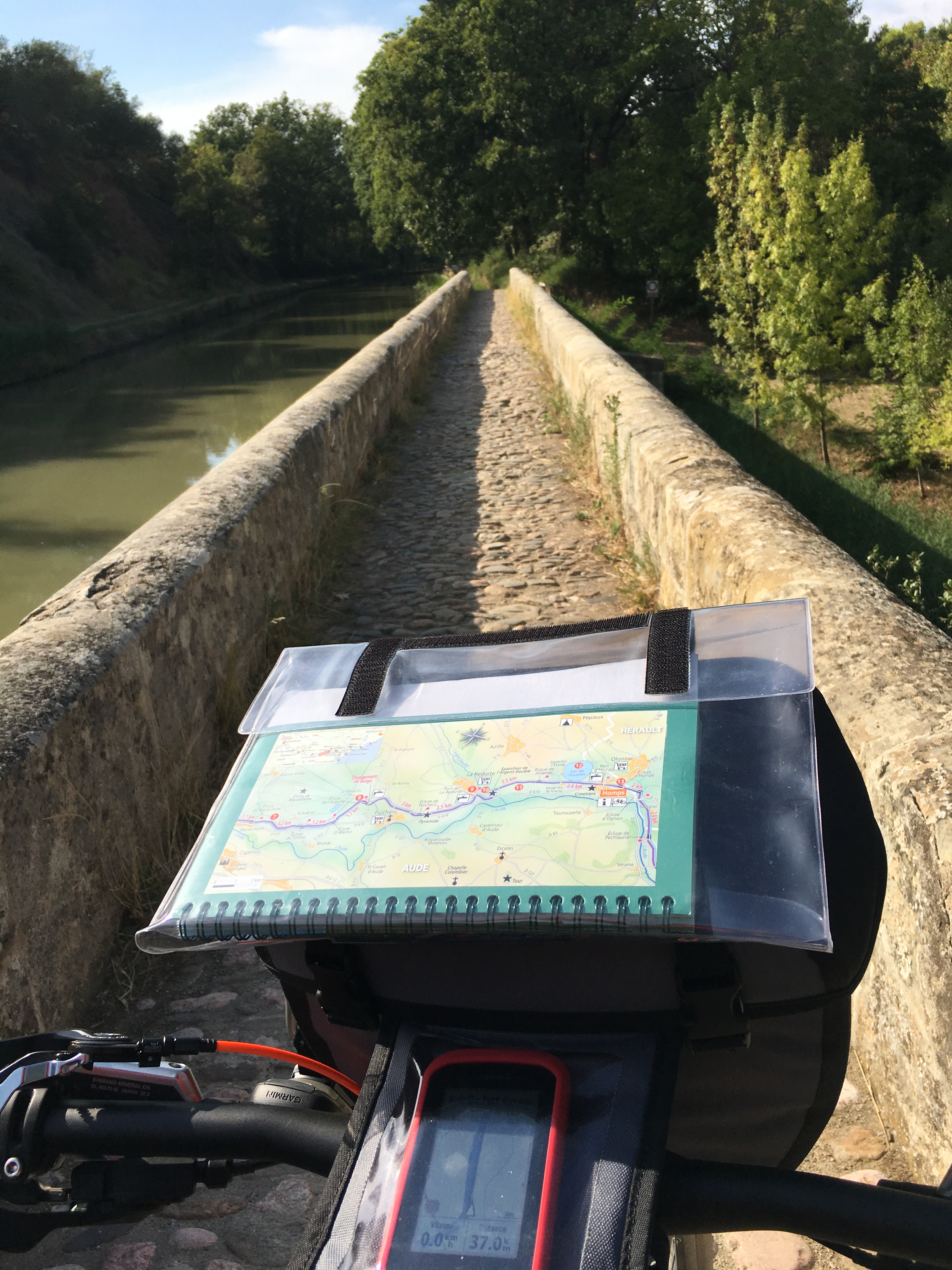 Cela peut paraître simple de suivre l’itinéraire en suivant tout simplement le Canal mais finalement il y a quelques petits passages pièges et des changements de berges à ne pas rater sous peine de devoir revenir en arrière et rallonger la route. JE ne peux que vous conseiller donc de partir soit avec une carte détaillée précisant le parcours et annotée soit avec un GPS qui va bien. Pour ma part je pars donc avec un GPS Garmin Edge 1000 ainsi qu’un Garmin eTrex 30 (pour deux usages différents : le Edge pour me guider et enregistrer les données d’effort et le eTrex 30 pour enregistrer la trace détaillée de notre aventure et la partager et aussi pour pouvoir disposer d’un GPS plus complet qu’un GPS orienté plutôt sport.)