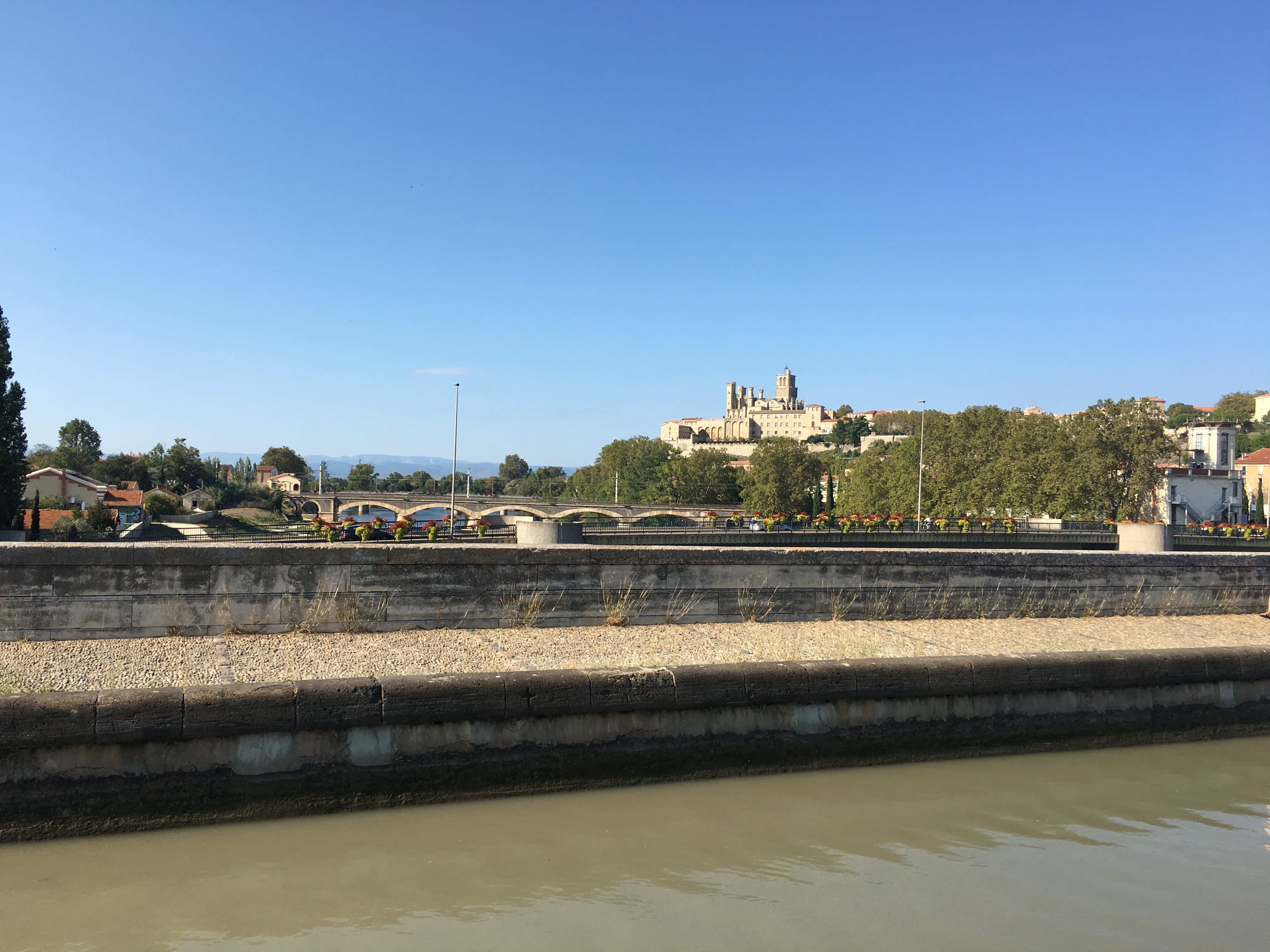 Nous arrivons non sans mal à trouver la fin du chantier et à rejoindre le bord du canal sur un magnifique pont-Canal qui nous offre une non moins splendide vue sur la ville de Béziers.