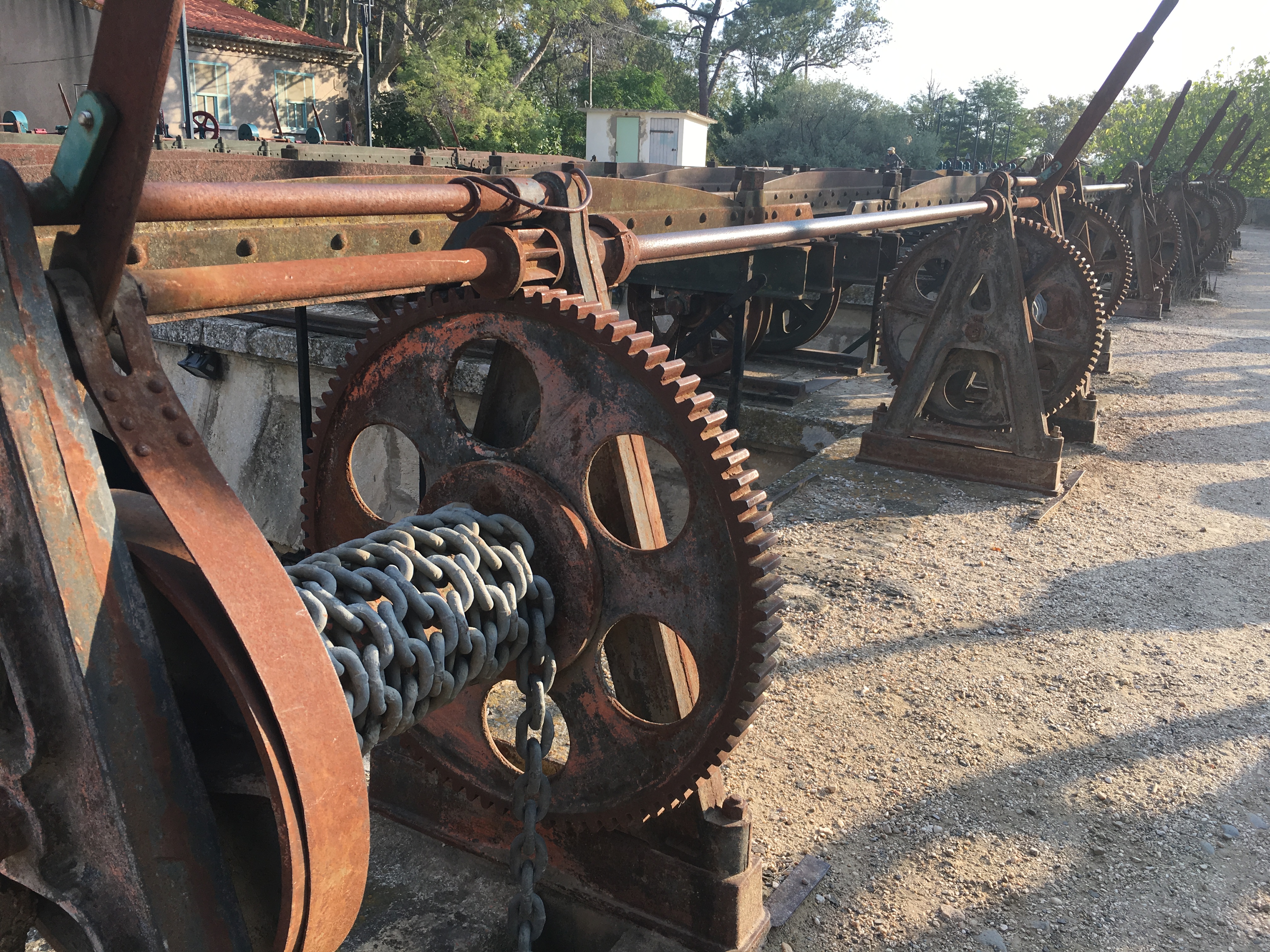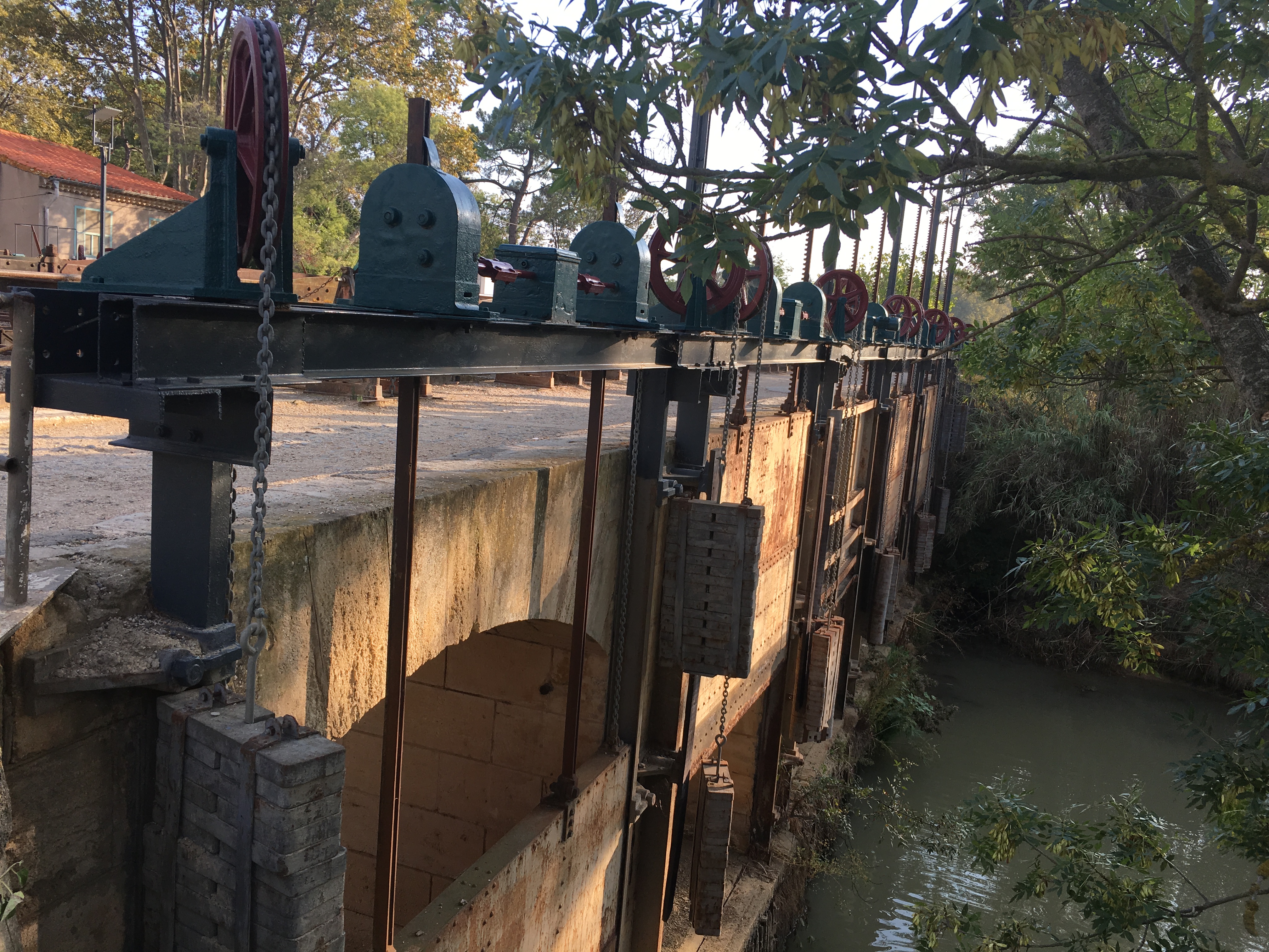 Nous descendons de nos vélos pour traverser les ouvrages du Libron. Ces ouvrages sur le Canal étaient destinés à en éviter l’ensablement et permettre de continuer la navigation y compris en période de drue du Libron. L’ouvrage comptent de nombreux mécanismes métalliques imposants.